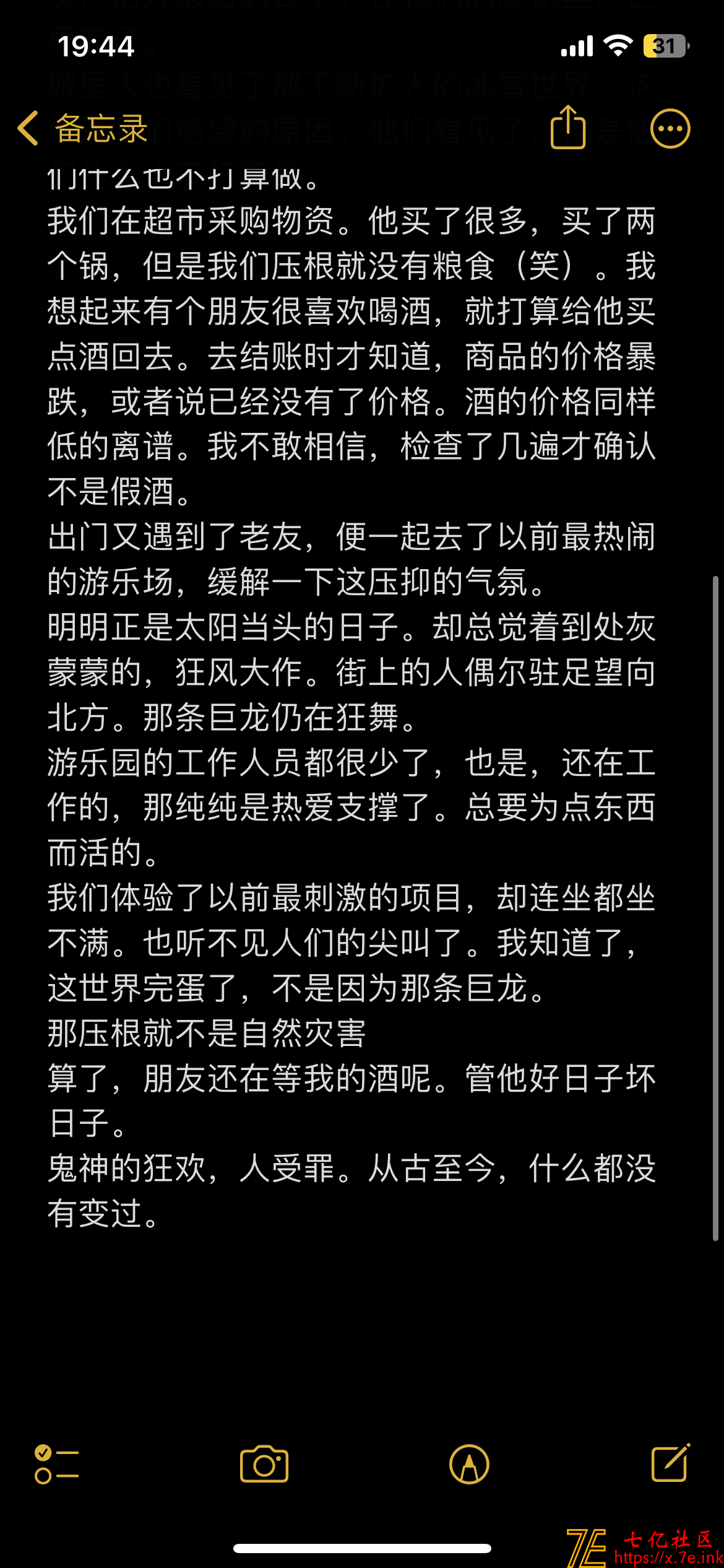 我们体验了以前最刺激的项目,却连坐都坐不满。也听不见人们的尖叫了。我知道了,这世界完蛋了,不是因为那条巨龙。